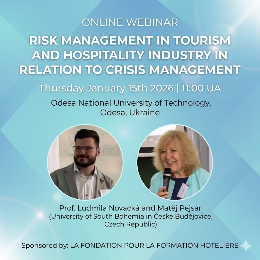 15 січня 2026 року викладачі кафедри технології ресторанного і оздоровчого харчування (ТРіОХ) взяли участь у міжнародному вебінарі «Risk Management in Tourism and Hospitality Industry in Relation to Crisis Management».